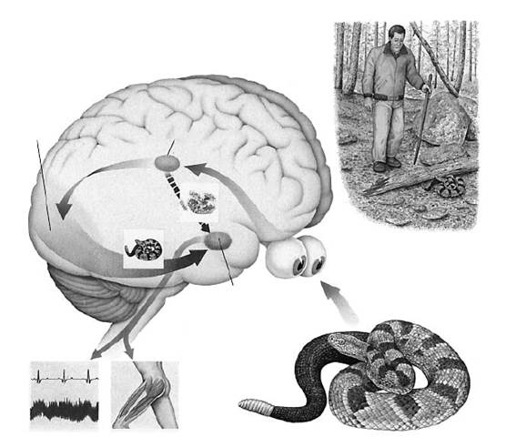 One example of how the thalamo-amygdala pathway works is depicted here, with a hiker in the woods who sees a shape on the ground. The visual stimuli are processed by the thalamus, which passes a crude template of the shape directly to the amygdala. The brain starts responding instantly, raising heart rate and blood pressure, and causing muscles to contract, in preparation for fight or flight. When the information from the thalamus reaches the visual cortex, the brain can determine whether the shape is actually a snake or not—in which case, the fear response is allowed to go forward or is quelled.