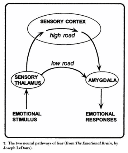 A key player in our emotional behavior, the amygdala also receives sensory information directly from the thalamus—the so-called “low road”—and triggers a variety of bodily responses even before the information has been processed by the cortex.