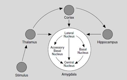 Intervienen las sensaciones percibidas, el tálamo, la via rápida a la amígdala y la via de proceso lento a través de la corteza visual.